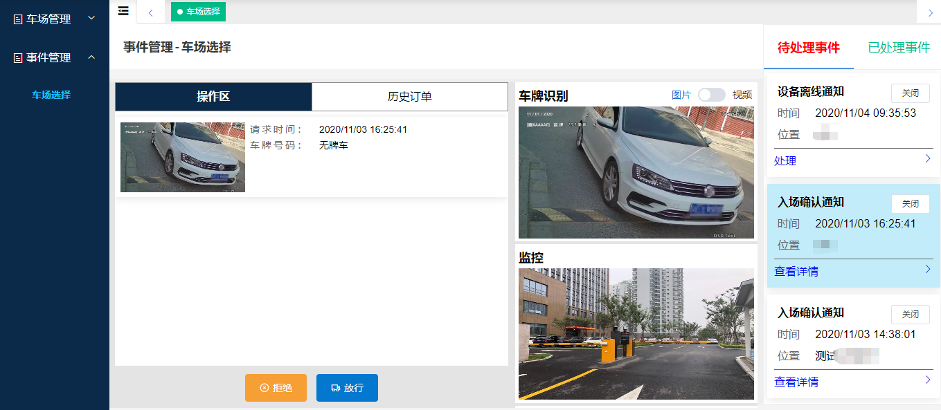 云平臺可統(tǒng)一處理多個車場的現(xiàn)場異常情況,例如無牌車入場確認申請、語音呼叫等事宜。