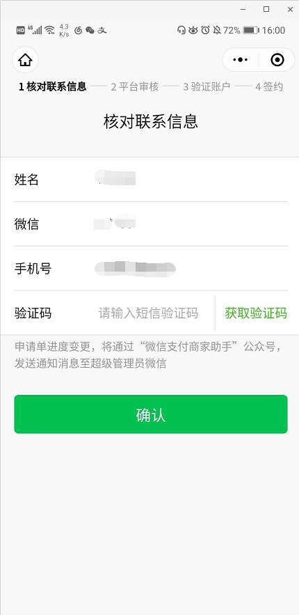 1.在賬戶待驗(yàn)證階段,打款時打款信息填寫錯誤,導(dǎo)致微信審核不過。