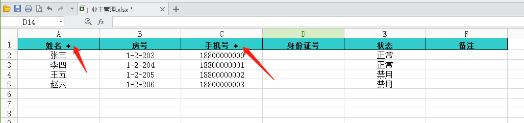 導(dǎo)入業(yè)主信息Excel表格的格式如下,業(yè)主姓名和手機(jī)號(hào)必填: