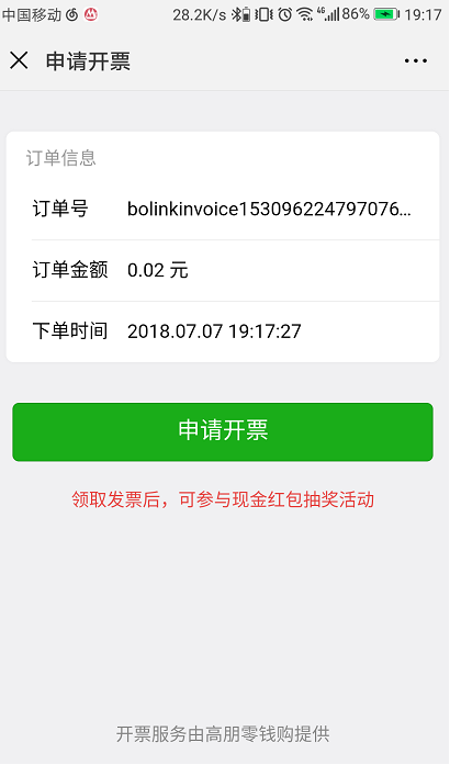 1、支付完成頁面點擊領(lǐng)取發(fā)票(目前僅支持微信支付完成頁面開票)