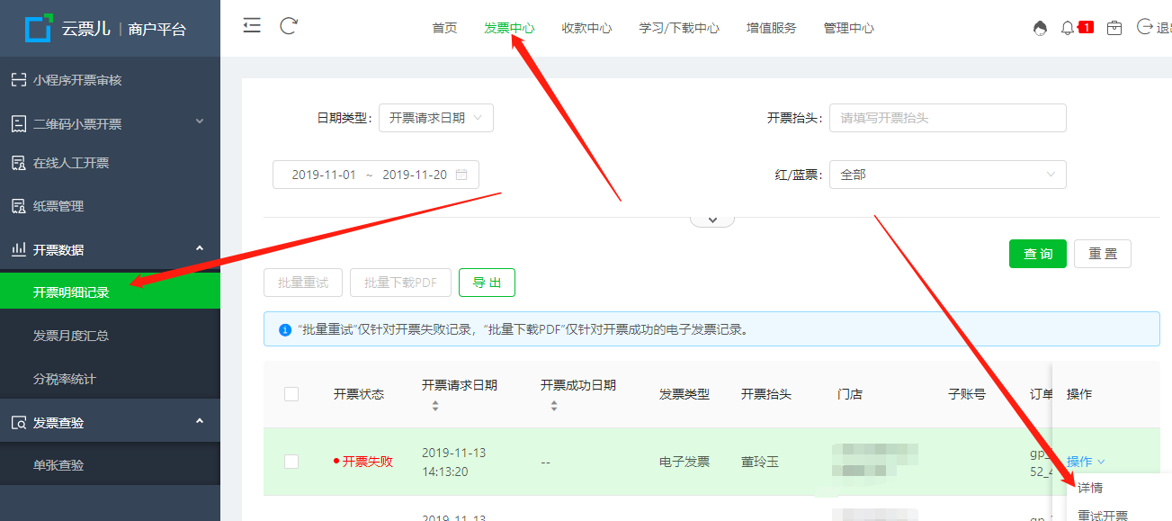 如果看到開通失敗的,可以點擊詳情查看錯誤原因,如果是提示助手不在線,請在電腦端打開云票兒助手,然后在網(wǎng)頁端點擊重試就好。
