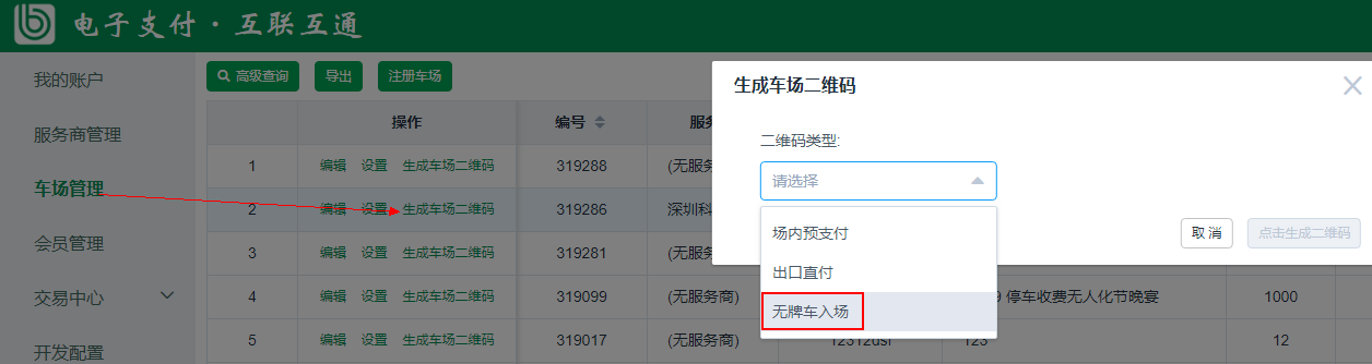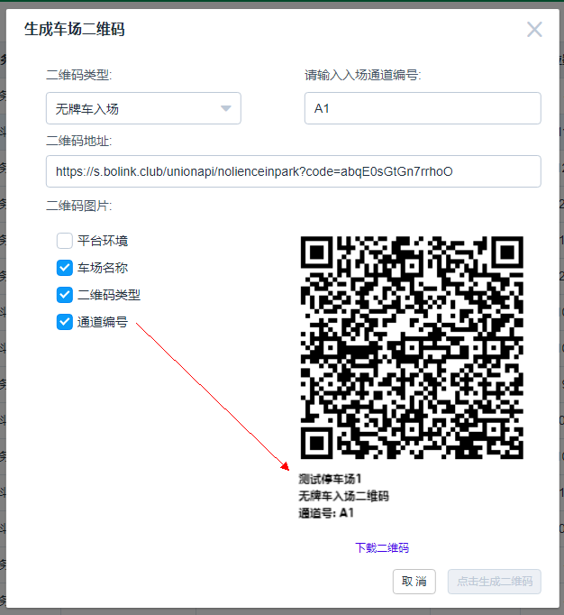 1、廠商平臺管理員登錄本廠商的泊鏈后臺,選擇車場管理模塊,在需要生成場內(nèi)預付碼的車場點擊“生成車場二維碼”,二維碼類型選擇“無牌車入場”,輸入入場通道編號,點擊生成二維碼,即可生成對應(yīng)二維碼??晒催x該圖片下方的標記項、可下載圖片、可復制二維碼地址。