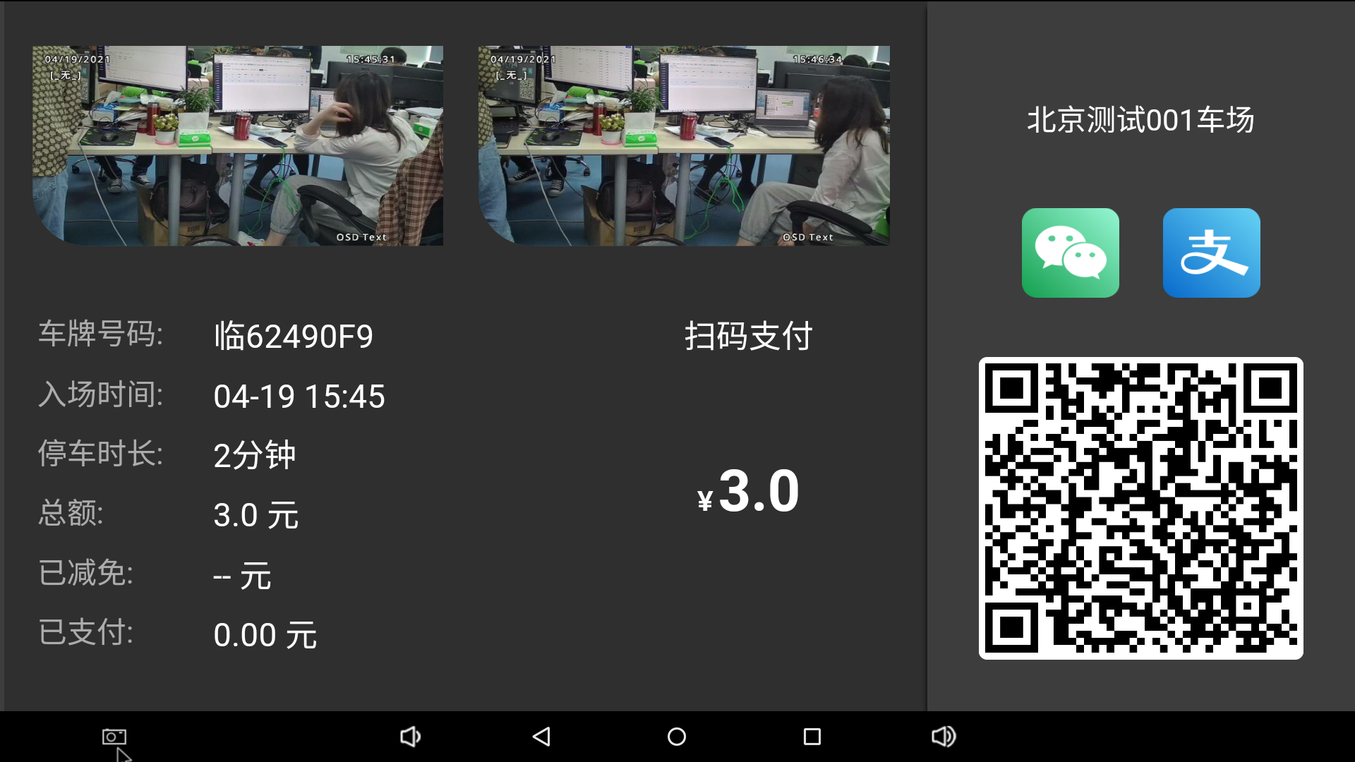 相機(jī)識(shí)別到車牌,智慧屏更新帶有車牌、時(shí)間等信息的二維碼,提示車主掃碼查詢價(jià)格。(2分鐘有效)