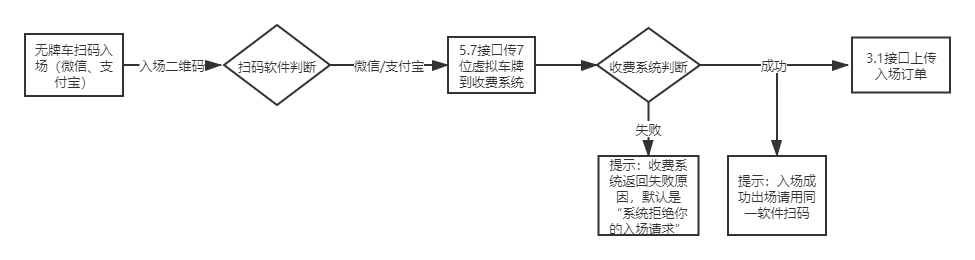 1、無牌車入場:泊鏈廠商后臺生成對應入口的二維碼,做成燈箱等物料形式貼在入口處,車主通過微信或支付寶掃一掃,然后泊鏈發(fā)送生成的無牌車(7位數(shù)字和字母組合)入場消息給入場通道對應的停車收費系統(tǒng),系統(tǒng)判斷是否允許入場。