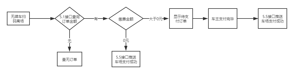 3、無牌車離場:泊鏈廠商后臺生成對應離場通道二維碼,車主用入場掃碼用的軟件掃碼,泊鏈會推送消息到管理對應出口通道的電腦上請求離場結算,如無需繳費會自動放行,如需繳費車主支付完對應費用,泊鏈通知車場放行。