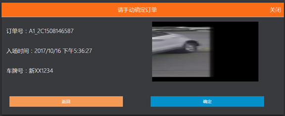 車輛出場時,車牌識別錯誤,沒有精確匹配到訂單。收費系統(tǒng)調用接口2.17上傳該車牌信息到云平臺,并調用接口2.12上傳該車輛的圖片(picture_source為confirm),云平臺查詢匹配進場訂單,在中央監(jiān)控頁面展示該事件,管理員查看事件,比對該車圖片與匹配出的車輛圖片,選出對應車輛,之后調用接口3.17下發(fā)匹配訂單信息給車場,車場收到該訂單予以結算放行。(注:事件未上傳圖片時,中央監(jiān)控頁面不予顯示)
