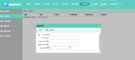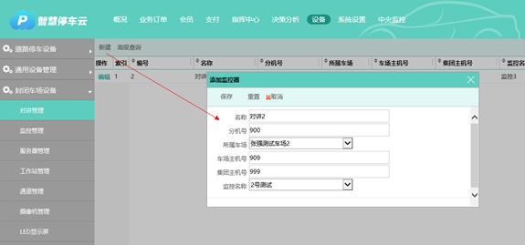 在車場和集團的設備管理模塊,可以添加對講,輸入對講的名稱、分機號、對應主機號、對應監(jiān)控等信息,分機號和主機號由泊鏈分配。添加對講時,可綁定指定的監(jiān)控,當車主呼叫中控室時該監(jiān)控會放大顯示當前畫面。
