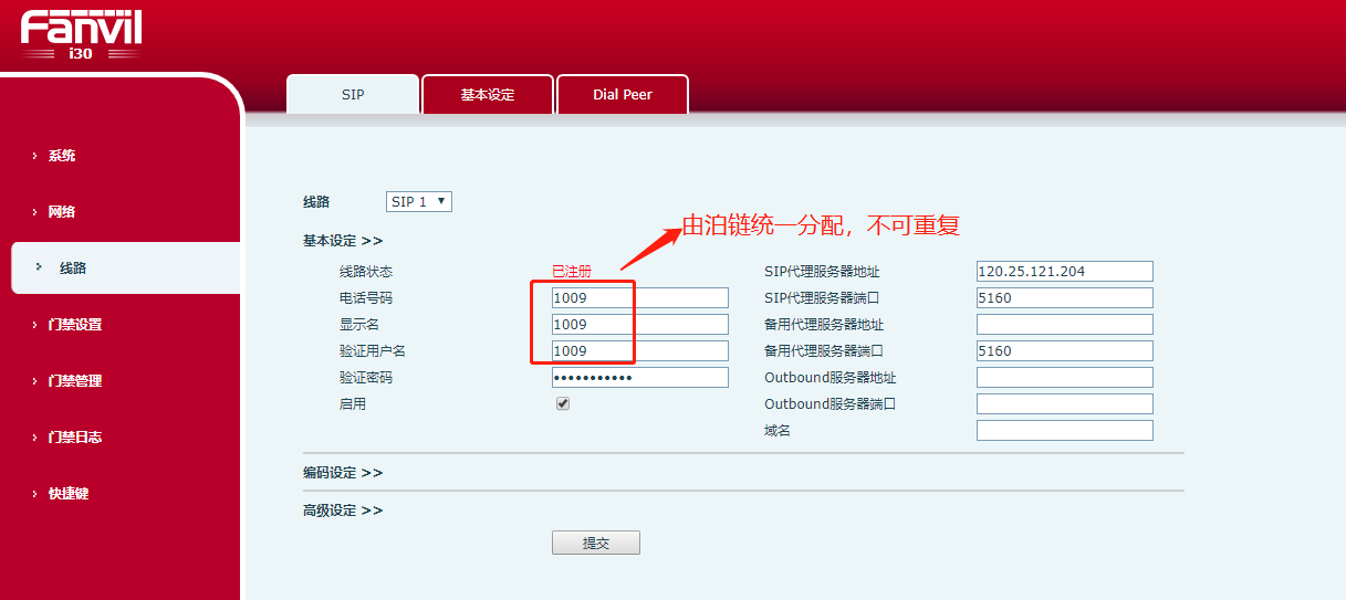 (2)線路模塊可修改當前對講設備的電話號碼,輸入泊鏈統(tǒng)一分配的對講賬號,驗證密碼統(tǒng)一為17701081721,其他參數按圖中填寫即可。